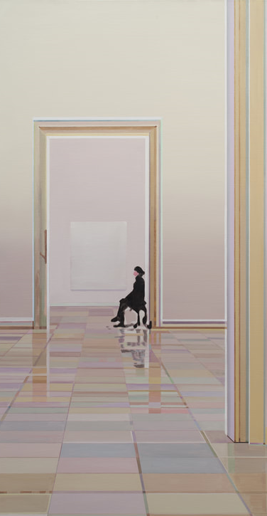Yang Bodu was born in 1986 in Tianjin. In her work, centered on painting, the artist depicts a series of architectural landscapes comprising museums, galleries, and art institutions, exploring the complex contradiction between the intimate encounter with the artworks and the public nature of exhibition spaces.