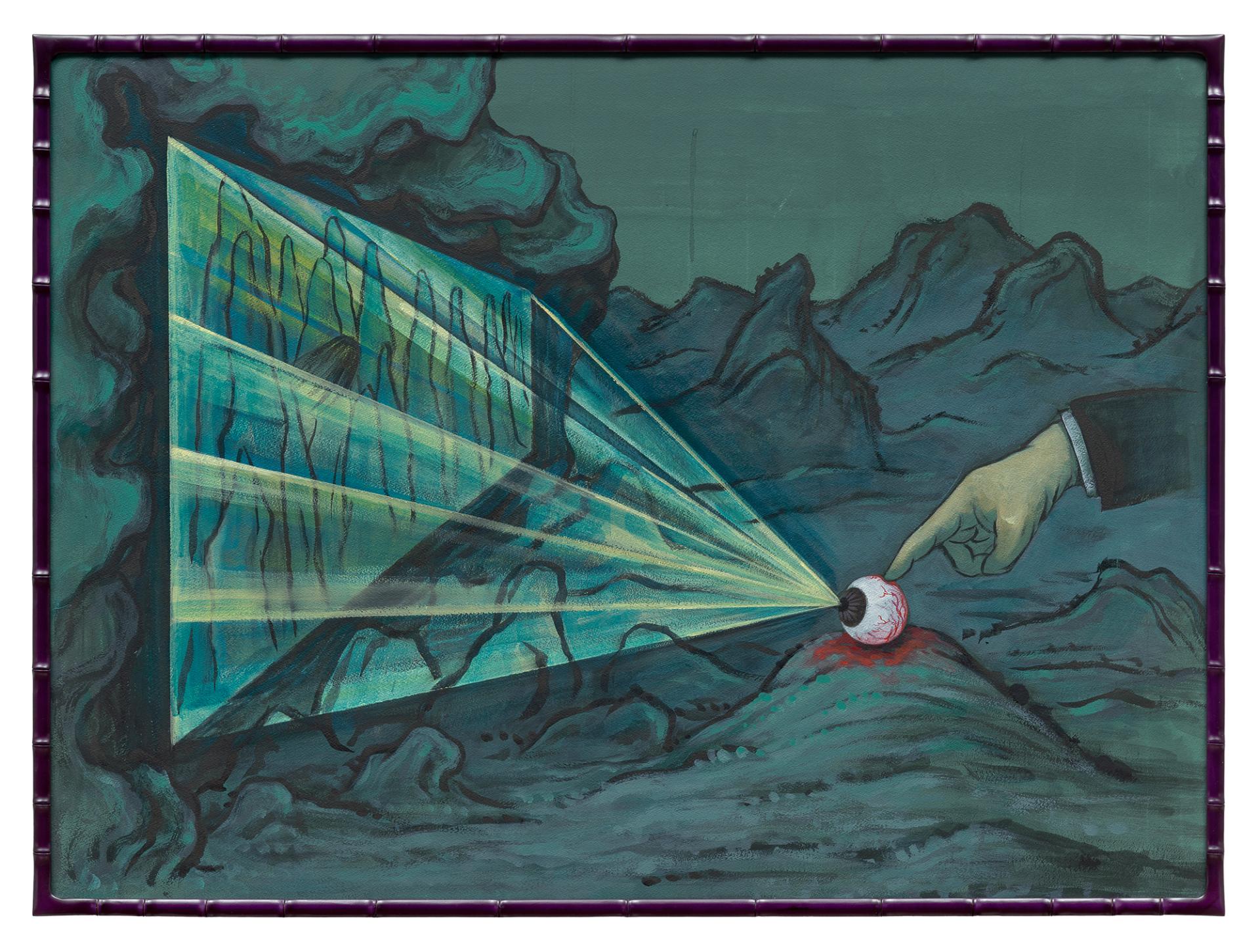 The work Zen Master Eyeball (2025) reimagines the wellknown Zen story of the monk Juzhi (known in Korea as Guji). In the original tale, Juzhi cut off the finger of a novice who merely imitated his gesture of raising a single finger to signify enlightenment without understanding it. Park adapts this story into a fictional narrative painting centered on the figure of “Zen Master Eyeball.” In the painting, the novice may be read as a metaphor for a painter—or even for the artist himself. The scene can thus be understood as a somewhat self-deprecating question posed by a visual artist who endlessly imitates others and only arrives at true insight after losing his eyes. Other works similarly transform episodes from Buddhist lore into what might be described as a kind of grotesque, Zeninspired science fiction.