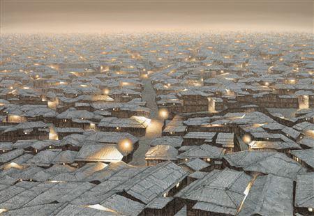 Joungju Joung paints unique urban landscapes inspired by her homeland. Her works capture urban scenes that stretch as far as the eye can see, dotted with flickering lights that suggest a dense yet invisible human presence. She doesn't cheat; she makes honest representations of exposed brick, slate roofs, and rusted gates. Joung Young-Ju creates these images by crumpling and unfolding traditional Korean paper on which she paints her works.