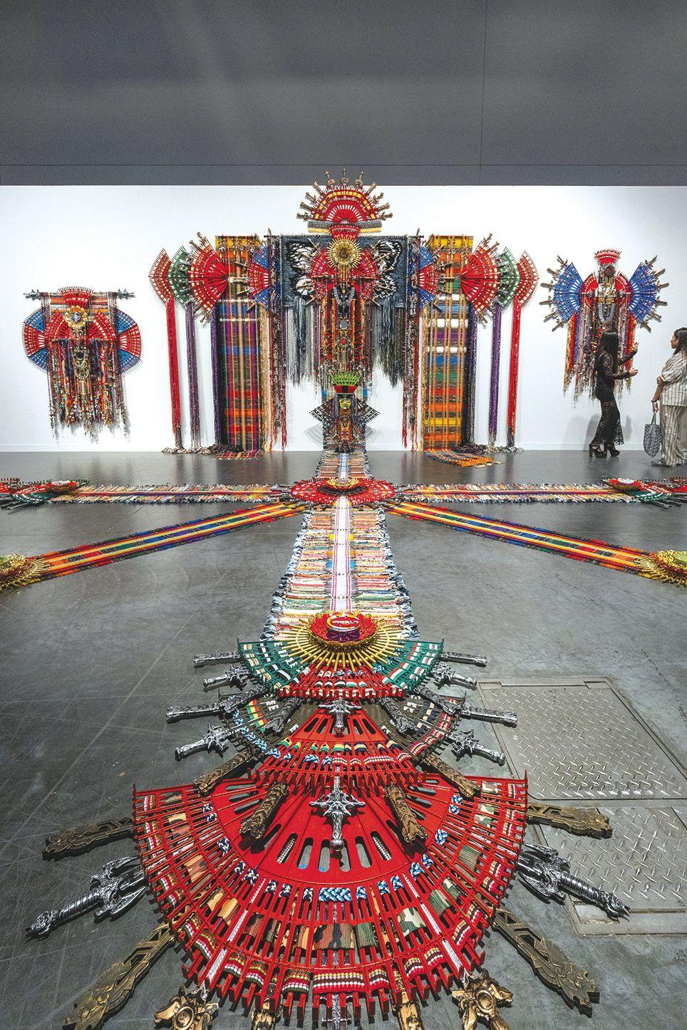 The installation comprises pieces woven on a loom, hand-painted rattan sticks, rakes, plastic swords, keys, corks, hose clamp brackets, washers, and many other objects.