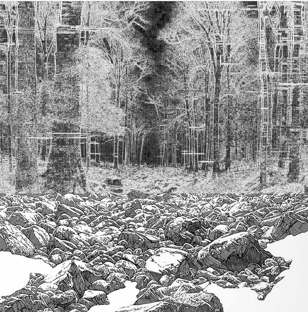 Le jeune artiste coréen Seungwahn Lee quant à lui propose un travail très subtil, intégrant des coordonnées GPS et des données visuelles des outils d'IA, pour créer des images qu'il retravaille ensuite à la peinture acrylique ou au dessin, donnant naissance à des œuvres oscillant entre fidélité documentaire et distorsion numérique. Dans ses dernières peintures, il est parti de l’observation des paysages de la forêt de Fontainebleau. Ces paysages, ne sont ni tout à fait réels ni entièrement fictifs, ils faut par contre les observer de près pour en comprendre tout l'impact. L'artiste interroge ainsi la manière dont nos outils technologiques remodèlent notre rapport à la mémoire et au territoire.
